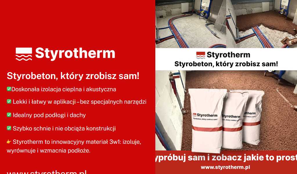 Technologia styrobetonu, stosowana przez Styrotherm w Psarach, pozwala na szybkie wyrównanie i docieplenie stropów. Materiał ma niską masę objętościową (ok. 200–300 kg/m³), co znacząco odciąża konstrukcję. Wylewki wykonywane są warstwowo, z pełnym kontrolowaniem grubości. W połączeniu z płynnym styropianem uzyskuje się skuteczną barier